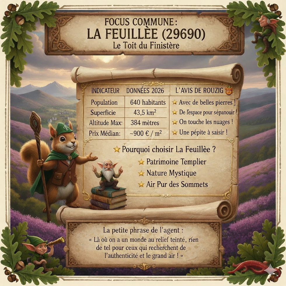 « Bienvenue à La Feuillée, le bourg le plus haut de Bretagne ! Ici, l'air est plus vif, le granit plus gris et les légendes plus vraies qu'ailleurs. À La Feuillée, on ne vit pas seulement en altitude, on vit dans l'histoire des Templiers et le souffle des landes. C’est un endroit pour les âmes fortes et les amoureux de l'immensité. »